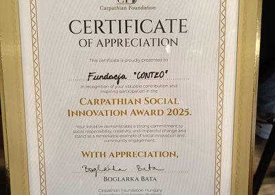 Nagrodę otrzymał projekt Fundacji CONTEO: „Rzeszowskie ruchome szlaki – inkluzja w branży logistycznej”, a ceremonia wręczenia nagród, zorganizowana przez Fundację Karpacką –Węgry, odbyła się w dniach 29-31 lipca 2025 w Egerze.