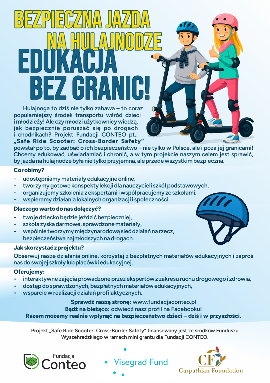 Dlatego Fundacja CONTEO rozpoczęła działania edukacyjne, których celem jest szerzenie informacji o zmianach w przepisach ruchu drogowego z udziałem hulajnóg, oraz prowadzenie warsztatów dla dzieci i młodzieży w ramach projektu: „Bezpieczna jazda na hulajnodze – edukacja bez granic” („Safe Ride Scooter: Cross-Border Safety”).